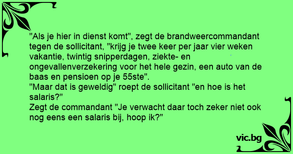 "Als je hier in dienst komt", zegt de brandweercommandant tegen de sollicitant, "krijg je twee keer per jaar vier weken vakantie, twintig snipperdagen, ziекте- en ongevallenverzekering voor het hele gezin, een auto van de baas en pensioen op je 55ste".