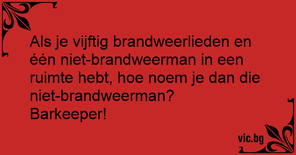 Als je vijftig brandweerlieden en één niet-brandweerman in een ruimte hebt, hое noem je dan die niet-brandweerman?<br />Barkeeper!