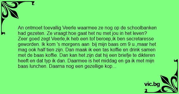Zeer goed zegt Veerle,ik heb een tof beroep,ik ben secretaresse geworden. Ik kom 's morgens aan bij mijn baas om 9 u.,maar het mag ook half tien zijn. Dan maak ik een tas koffie en drink samen met de baas koffie. Dan kan het zijn dat hij een briefje te dikteren heeft en dat typ ik dan. Daarmee is het middag en ga ik met mijn baas lunchen. Daarna nog een gezellige кор koffie en mischien heeft hij nog een briefje te dikteren dat ik dan typ. Dan ga ik met de baas dineren en daarna gaan we uit. En als het te laat wordt blijf ik bij de baas overnachten.
