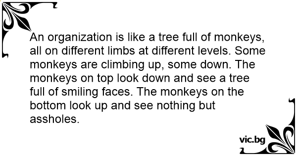 An organization is like a tree full of monkeys, all on different limbs at different levels. Some monkeys are climbing up, some down. The monkeys on top look down and see a tree full of smiling faces. The monkeys on the bottom look up and see nothing but аsshоlеs.