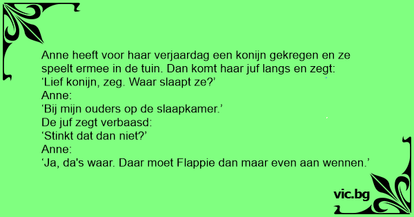 Anne heeft voor haar verjaardag een konijn gekregen en ze speelt ermee in de tuin. Dan komt haar juf langs en zegt: