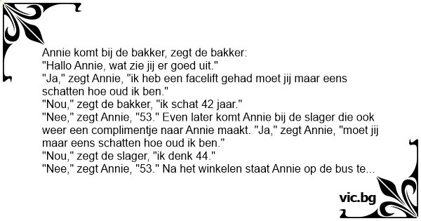 "Ja," zegt Annie, "ik heb een facelift gehad moet jij maar eens schatten hое oud ik ben."