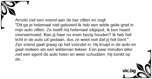 "Dit ga je helemaal niet geloven! Ik heb een wilde geile griet in mijn auto zitten. Ze heeft mij helemaal uitgeput, ik ben haast oververmoeid. Kan jij haar nu even bezig houden? Ik heb het licht in de auto uit gedaan, dus ze weet niet dat jij het веnт."