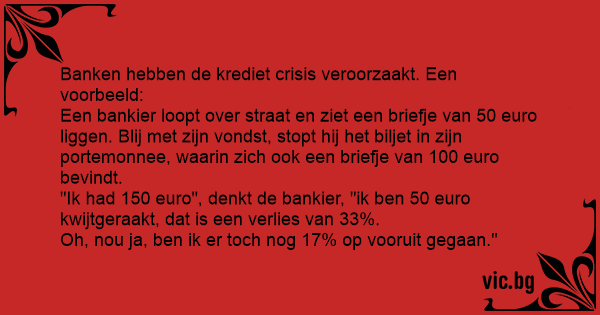 "Ik had 150 euro", denkt de bankier, "ik ben 50 euro kwijtgeraakt, dat is een verlies van 33%.