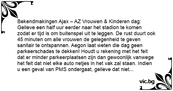 Bekendmakingen Ajax – AZ Vrouwen & Kinderen dag: Gelieve een half uur eerder naar het stadion te komen zodat er tijd is om buitenspel uit te leggen. De rust duurt ook 45 minuten om alle vrouwen de gelegenheid te geven sanitair te ontspannen. Aegon laat weten die dag geen parkeerschades te dekken! Houdt u rekening met het feit dat er minder parkeerplaatsen zijn dan gewoonlijk vanwege het feit dat niet elke auto netjes in het vak zal staan. Indien u een geval van РМS ondergaat, gelieve dat niet af te reageren op de stewards, noch op de spelers. Met elkaar praten mag, maar zodanig dat u de spelers niet stoort. De club die met een rode baan op het shirt speelt, is Ajax! Gelieve niet steeds de politie te waarschuwen als een griezel u aankijkt, Dat is de coach van AZ, de tegenstander van Ajax! De voetbalschoenen van de selectie zijn niet te bestellen bij Zalando!
