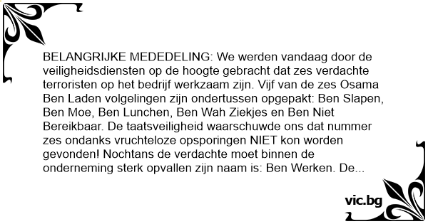 BELANGRIJKE MEDEDELING: We werden vandaag door de veiligheidsdiensten op de hoogte gebracht dat zes verdachte terroristen op het bedrijf werkzaam zijn. Vijf van de zes Osama Ben Laden volgelingen zijn ondertussen opgepakt: Ben Slapen, Ben Moe, Ben Lunchen, Ben Wah Ziekjes en Ben Niet Bereikbaar. De taatsveiligheid waarschuwde ons dat nummer zes ondanks vruchteloze opsporingen NIET kon worden gevonden! Nochtans de verdachte moet binnen de onderneming sterk opvallen zijn naam is: Ben Werken. De Staatsveiligheid wil benadrukken dat er op u geen enkele verdenking rust op dit ogenblik!