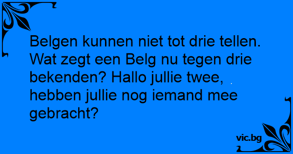 Belgen kunnen niet tot drie tellen. Wat zegt een Belg nu tegen drie bekenden? Hallo jullie twee, hebben jullie nog iemand mee gebracht?