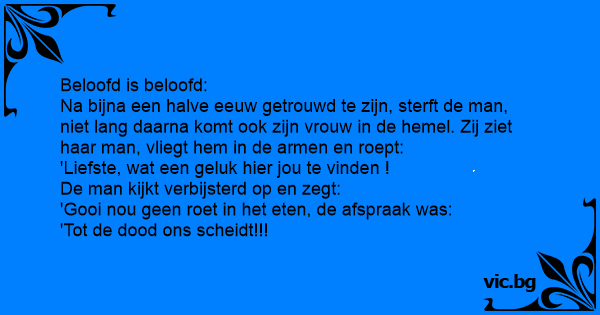 Een man en een vrouw komen aan in de hemel. De vrouw zegt: “Oh, wat heerlijk! Nu zijn we weer samen!” Waarop de man zegt: “Echt niet, de afspraak was tot de dood ons scheidt!”