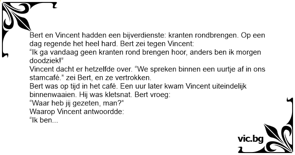 Bert en Vincent hadden een bijverdienste: kranten rondbrengen. Op een dag regende het heel hard. Bert zei tegen Vincent: