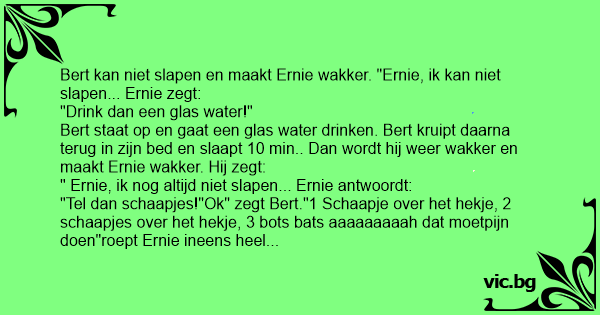 "Tel dan schaapjes!"Ok" zegt Bert."1 Schaapje over het hekje, 2 schaapjes over het hekje, 3 bots bats aaaaaaaaah dat moetpijn doen"roept Ernie ineens heel luid."Wwwat is er Bert?"Stamelt Ernie."Het schaapje sprong niet over het hekje!!!"