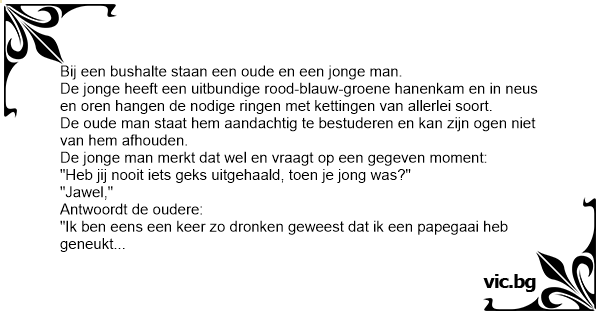Egy öregember üldögél egy padon. Odaül mellé egy punk csávó a szivárvány színeiben játszó tarajos hajával. Az öreg csak bámul rá. Végül a punk nem bírja tovább és megkérdezi: - Mi van tata, még...