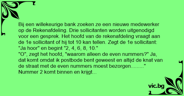 Bij een willekeurige bank zoeken ze een nieuwe medewerker op de Rekenafdeling. Drie sollicitanten worden uitgenodigd voor een gesprek. Het hoofd van de rekenafdeling vraagt aan de 1e sollicitant of hij tot 10 kan tellen. Zegt de 1e sollicitant: