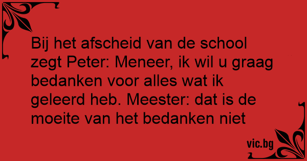 Bij het afscheid van de school zegt Peter: Meneer, ik wil u graag bedanken voor alles wat ik geleerd heb. Meester: dat is de moeite van het bedanken niet