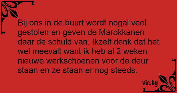 Bij ons in de buurt wordt nogal veel gestolen en geven de Marokkanen daar de schuld van. Ikzelf denk dat het wel meevalt want ik heb al 2 weken nieuwe werkschoenen voor de deur staan en ze staan er nog steeds.
