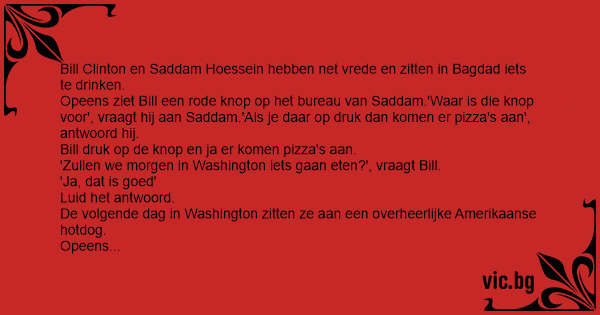 Opeens ziet Bill een rode knop op het bureau van Saddam.'Waar is die knop voor', vraagt hij aan Saddam.'Als je daar op druk dan komen er pizza's aan', antwoord hij.