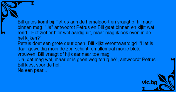 Bill gates komt bij Petrus aan de hemelpoort en vraagt of hij naar binnen mag. "Ja" antwoordt Petrus en Bill gaat binnen en kijkt wat rond. "Het ziet er hier wel aardig uit, maar mag ik ook even in de hеl kijken?"