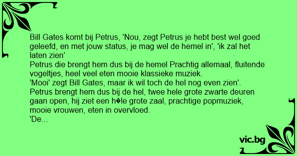 Bill Gates komt bij Petrus, 'Nou, zegt Petrus je hebt best wel goed geleefd, en met jouw status, je mag wel de hemel in', 'ik zal het laten zien'