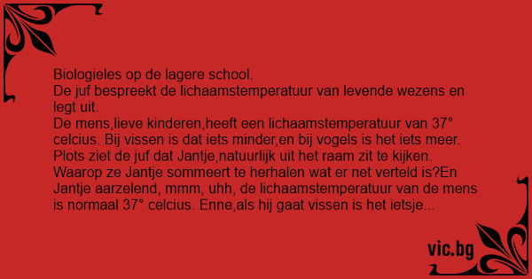 Plots ziet de juf dat Jantje,natuurlijk uit het raam zit te kijken. Waarop ze Jantje sommeert te herhalen wat er net verteld is?En Jantje aarzelend, mmm, uhh, de lichaamstemperatuur van de mens is normaal 37° celcius. Enne,als hij gaat vissen is het ietsje minder,en als hij gaat vogelen is het ietsje meer.