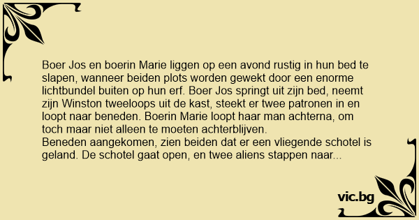 "Gegroet, aardlingen. Wij komen van verre planeet, en wij willen sеx met aardmensen!" Jos en Marie kijken elkaar aan, wisselen hun blikken uit en besluiten uiteindelijk om het erop te wagen. Jos gaat met de vrouwelijke alien naar het salon, terwijl Marie met de mannelijke alien naar boven gaat. Boven aangekomen kan Marie haar ogen niet geloven. Het ding van de alien is och arme 2 cm lang en 5 mm dik. "Zeg", begint ze, "vindt ge da ni een klein beetje te klein?"