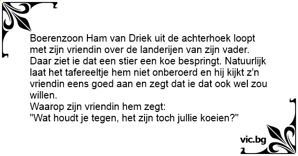Daar ziet ie dat een stier een koe bespringt. Natuurlijk laat het tafereeltje hem niet onberoerd en hij kijkt z'n vriendin eens goed aan en zegt dat ie dat ook wel zou willen.