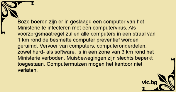 Boze boeren zijn er in geslaagd een computer van het Ministerie te infecteren met een computervirus. Als voorzorgsmaatregel zullen alle computers in een straal van 1 km rond de besmette computer preventief worden geruimd. Vervoer van computers, computeronderdelen, zowel hard- als software, is in een zone van 3 km rond het Ministerie verboden. Muisbewegingen zijn slechts beperkt toegestaan. Computermuizen mogen het kantoor niet verlaten.