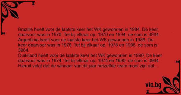 Brazilië heeft voor de laatste keer het WK gewonnen in 1994. De keer daarvoor was in 1970. Tel bij elkaar op, 1970 en 1994, de som is 3964.