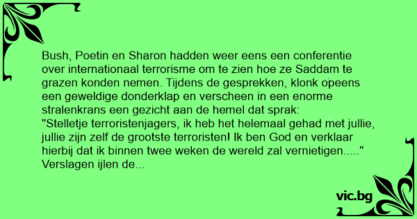 Bush, Poetin en Sharon hadden weer eens een conferentie over internationaal terrorisme om te zien hое ze Saddam te grazen konden nemen. Tijdens de gesprekken, klonk opeens een geweldige donderklap en verscheen in een enorme stralenkrans een gezicht aan de hemel dat sprak: