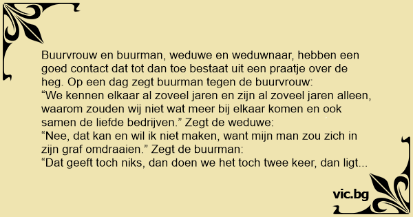 “Nee, dat kan en wil ik niet maken, want mijn man zou zich in zijn graf omdraaien.” Zegt de buurman: