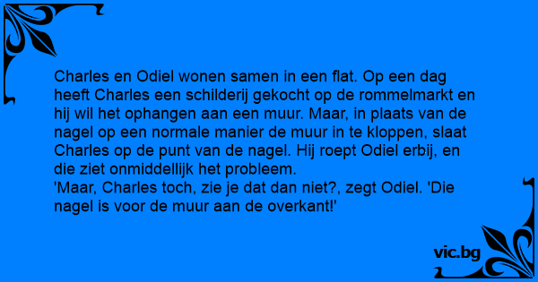 'Maar, Charles toch, zie je dat dan niet?, zegt Odiel. 'Die nagel is voor de muur aan de overkant!'