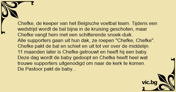Chefke, de keeper van het Belgische voetbal team. Tijdens een wedstrijd wordt de bal bijna in de kruising geschoten, maar Chefke vangt hem met een schitterende snoek-duik.