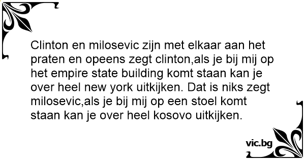 Clinton en milosevic zijn met elkaar aan het praten en opeens zegt clinton,als je bij mij op het empire state building komt staan kan je over heel new york uitkijken. Dat is niks zegt milosevic,als je bij mij op een stoel komt staan kan je over heel kosovo uitkijken.