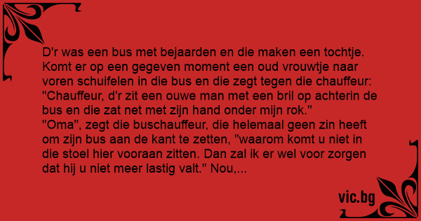 "Oma", zegt die buschauffeur, die helemaal geen zin heeft om zijn bus aan de kant te zetten, "waarom komt u niet in die stoel hier vooraan zitten. Dan zal ik er wel voor zorgen dat hij u niet meer lastig valt." Nou, zo gezegd, zo gedaan. Een paar minuten later komt er weer een oud vrouwtje naar voren trompelen