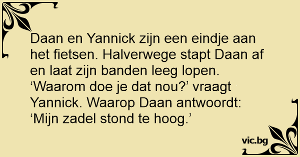 Daan en Yannick zijn een eindje aan het fietsen. Halverwege stapt Daan af en laat zijn banden leeg lopen. ‘Waarom doe je dat nou?’ vraagt Yannick. Waarop Daan antwoordt: ‘Mijn zadel stond te hoog.’