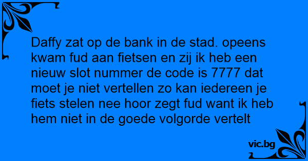 Daffy zat op de bank in de stad. opeens kwam fud aan fietsen en zij ik heb een nieuw slot nummer de code is 7777 dat moet je niet vertellen zo kan iedereen je fiets stelen nee hооr zegt fud want ik heb hem niet in de goede volgorde vertelt