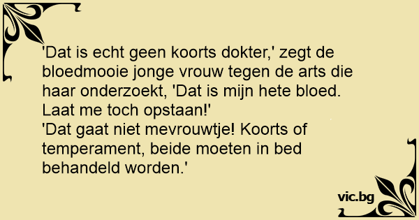 'Dat is echt geen koorts dokter,' zegt de bloedmooie jonge vrouw tegen de arts die haar onderzoekt, 'Dat is mijn hete bloed. Laat me toch opstaan!'