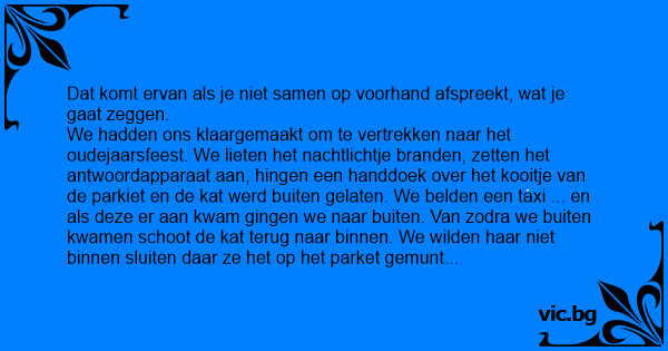 We hadden ons klaargemaakt om te vertrekken naar het oudejaarsfeest. We lieten het nachtlichtje branden, zetten het antwoordapparaat aan, hingen een handdoek over het kooitje van de parkiet en de kat werd buiten gelaten. We belden een taxi ... en als deze er aan kwam gingen we naar buiten. Van zodra we buiten kwamen schoot de kat terug naar binnen. We wilden haar niet binnen sluiten daar ze het op het parket gemunt had. Mijn vrouw ging al in de taxi zitten terwijl ik achter de kat aan moest. De kat rende de trap op en ik zette de achtervolging in. Mijn vrouw die in de taxi zat te wachten, wou niet dat de bestuurder wist dat het huis verlaten zou zijn vannacht. Dus vertelde ze de chauffeur :