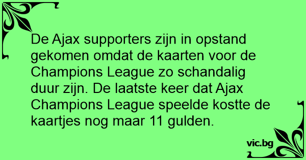 De Ajax supporters zijn in opstand gekomen omdat de kaarten voor de Champions League zo schandalig duur zijn. De laatste keer dat Ajax Champions League speelde kostte de kaartjes nog maar 11 gulden.