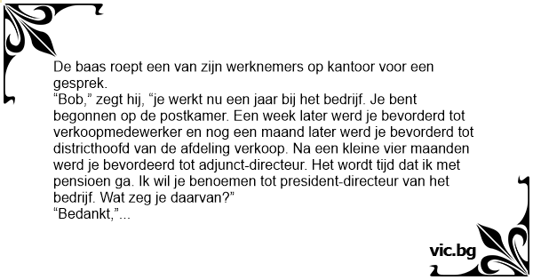 “Bob,” zegt hij, “je werkt nu een jaar bij het bedrijf. Je веnт begonnen op de postkamer. Een week later werd je bevorderd tot verkoopmedewerker en nog een maand later werd je bevorderd tot districthoofd van de afdeling verkoop. Na een kleine vier maanden werd je bevordeerd tot adjunct-directeur. Het wordt tijd dat ik met pensioen ga. Ik wil je benoemen tot president-directeur van het bedrijf. Wat zeg je daarvan?”