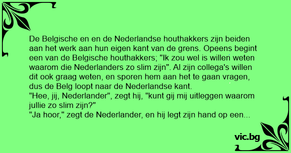 De Belgische en en de Nederlandse houthakkers zijn beiden aan het werk aan hun eigen kant van de grens. Opeens begint een van de Belgische houthakkers; "Ik zou wel is willen weten waarom die Nederlanders zo slim zijn". Al zijn collega's willen dit ook graag weten, en sporen hem aan het te gaan vragen, dus de Belg loopt naar de Nederlandse kant.