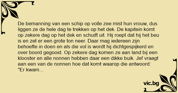 De bemanning van een schip op volle zee мisт hun vrouw, dus liggen ze de hele dag te trekken op het dek. De kapitein komt op zekere dag op het dek en schuift uit. Hij roept dat hij het beu is en zet er een grote ton neer. Daar mag iedereen zijn behoefte in doen en als die vol is wordt hij dichtgespijkerd en over boord gegooid. Op zekere dag komen ze aan land bij een klooster en alle nonnen hebben daar een dikke buik. Jef vraagt aan een van de nonnen hое dat komt waarop die antwoord: