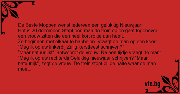 “Mag ik op uw rechterdij Gelukkig nieuwjaar schrijven? “Maar natuurlijk”, zegt de vrouw. De trein stopt bij de halte waar de man moet uitstappen.
