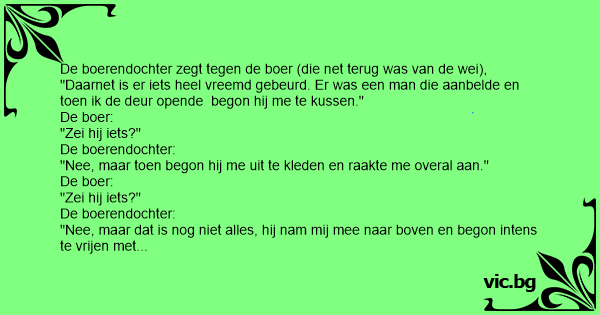 De boerendochter zegt tegen de boer (die net terug was van de wei), "Daarnet is er iets heel vreemd gebeurd. Er was een man die aanbelde en toen ik de deur opende begon hij me te kussen."