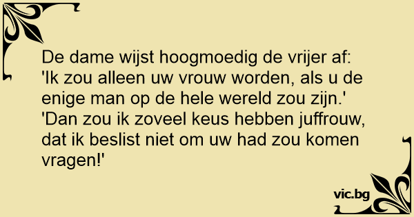 'Ik zou alleen uw vrouw worden, als u de enige man op de hele wereld zou zijn.'