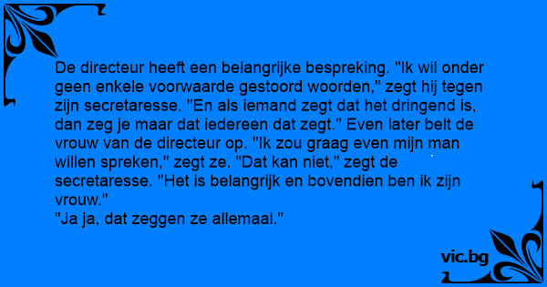 De directeur heeft een belangrijke bespreking. "Ik wil onder geen enkele voorwaarde gestoord woorden," zegt hij tegen zijn secretaresse. "En als iemand zegt dat het dringend is, dan zeg je maar dat iedereen dat zegt." Even later belt de vrouw van de directeur op. "Ik zou graag even mijn man willen spreken," zegt ze. "Dat kan niet," zegt de secretaresse. "Het is belangrijk en bovendien ben ik zijn vrouw."