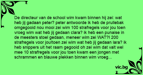 De directeur van de school wim kwam binnen hij zei: wat heb jij gadaan peter? peter antwoorde ik heb de prullebak omgegooid nou mooi zei wim 100 strafregels voor jou toen vroeg wim wat heb jij gedaan clara? ik heb een punaise in de meesters stoel gedaan, meneer wim zei WAT?! 200 strafregels voor jou!toen zei wim wat heb jij gedaan lara? ik heb snippers uit het raam gegooid oh zei wim dat valt wel mee 10 strafregels voor jou toen kwam een jongen met schrammen en blauwe plekken binnen wim vroeg wie ben jij nou weer?? ik ben sven meneer, sven snippers