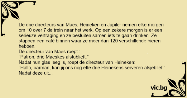 De drie directeurs van Maes, Heineken en Jupiler nemen elke morgen om 10 over 7 de trein naar het werk. Op een zekere morgen is er een serieuze vertraging en ze besluiten samen iets te gaan drinken. Ze stappen een café binnen waar ze meer dan 120 verschillende bieren hebben.