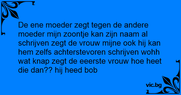 De ene moeder zegt tegen de andere moeder mijn zoontje kan zijn naam al schrijven zegt de vrouw mijne ook hij kan hem zelfs achterstevoren schrijven wohh wat knap zegt de eeerste vrouw hое heet die dan?? hij heed bob