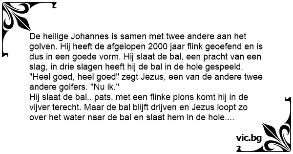 Mooses, Jeesus ja vanha mies oli pelaamassa golfia. Mooses asteli tiille ja löi palloa. Se meni peliväylän ohi ja laskeutui vesiesteeseen. Mooses halkaisi veden ja löi pallon greenille. Jeesus...