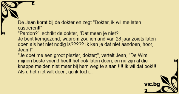 Een patiënt komt binnen in het kabinet van de dokter. " Dokter, ik kom mij laten castreren." "Bent U daar wel zeker van?" antwoordt deze geschrokken. "Jazeker dokter, ik vertrek op vakantie en ik...