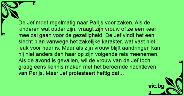 De Jef moet regelmatig naar Parijs voor zaken. Als de kinderen wat ouder zijn, vraagt zijn vrouw of ze een keer mee zal gaan voor de gezelligheid. De Jef vindt het een slecht plan vanwege het zakelijke karakter, wat vast niet leuk voor haar is. Maar als zijn vrouw blijft aandringen kan hij niet anders dan haar op zijn volgende reis meenemen. Als de avond is gevallen, wil de vrouw van de Jef toch graag eens kennis maken met het beroemde nachtleven van Parijs. Maar Jef protesteert heftig dat hij moe is en nooit uitgaat in Parijs. Maar wederom na het aanhouden van zijn vrouw blijft er geen keuze over dan uitgaan. Ze belanden in een nachtclub. Als de stripdanseres alleen nog een slipje draagt, komt de presentator naar voren, en roept om, "Wie trekt het laatste kledingstuk uit vanavond"? De hele tent begint luidkeels te roepen, "De Jef,De Jef,De Jef,De Jef,De Jef,De Jef,De Jef,.....". Woedend sleurt zijn vrouw hem mee naar buiten, houdt een taxi aan en smijt hem op de achterbank. In de taxi begint ze hem voor van alles en nog wat uit te maken, en scheldt hem compleet zijn huid vol. Plots draait de taxichauffeur zich om en zegt, "Zeg Jef, deze hоеr is nog mottiger dan die van over 14 dagen".